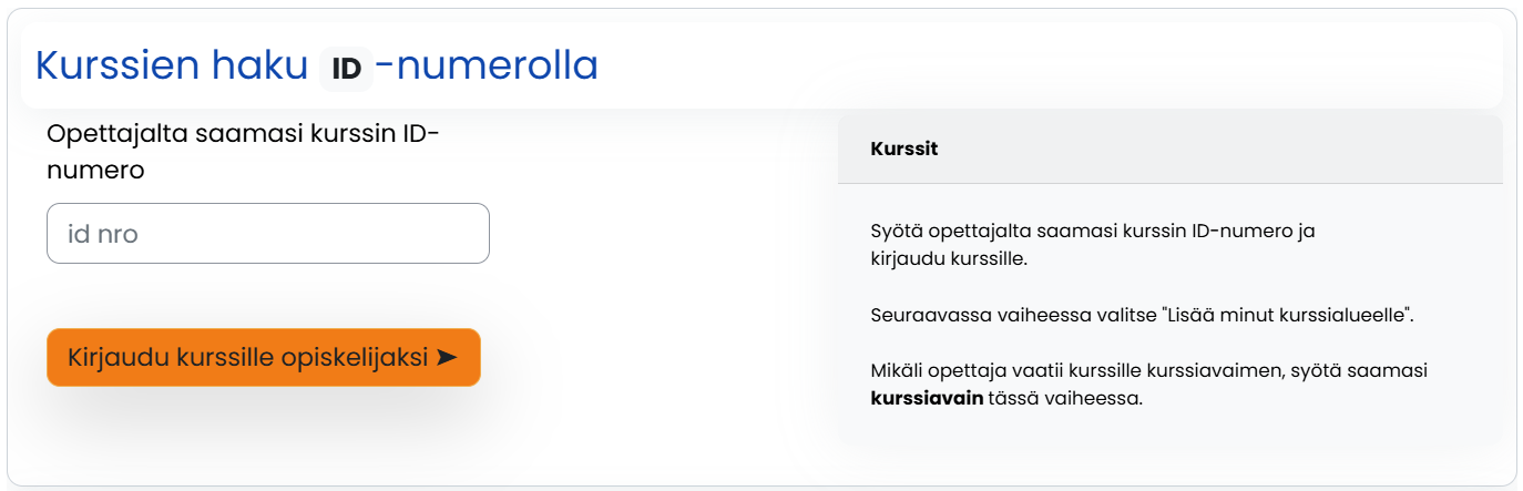 Vuoden 2026 alusta Easy Enroll -kurssiavain poistuu käytöstä, ja kurssien haku tapahtuu kurssin ID-numeron avulla. Opettaja antaa opiskelijalle kurssin ID-numeron sekä kurssiavaimen.