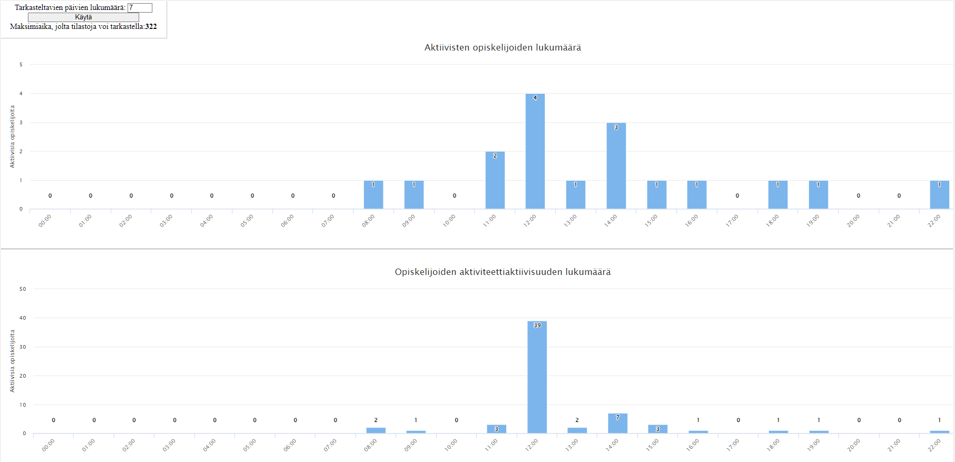 Näyttää, mihin vuorokauden aikaan opiskelijat ovat Moodlessa aktiivisia. Voit valita, montako edellistä päivää tarkastellaan, aikaisintaan toteutuksen alkamispäivästä lähtien. | Voit käyttää apuna ajoituksen suunnitteluun. Kellonajan yhteydessä olevaa palkkia klikkaamalla näet opiskelijoiden nimet. Voit lähettää heille sähköpostiviestin. | |