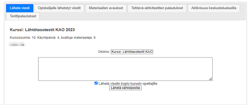 | Voit seurata opiskelijoiden aktiivisuutta toteutuksen aikana. Näkymästä voit tunnistaa putoamisvaarassa olevat opiskelijat. Voit lähettää sähköpostiviestin opiskelijoille, jotka eivät koskaan ole avanneet mitään | |