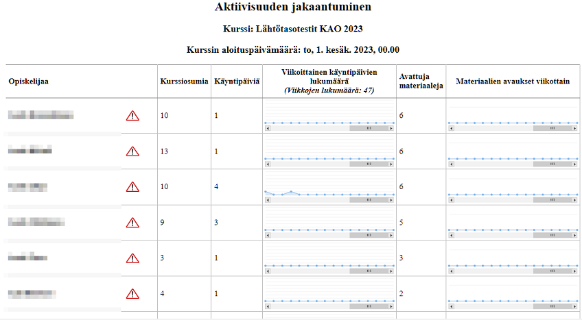Näyttää jokaisen opiskelijan aktiivisuuden viikoittain:
